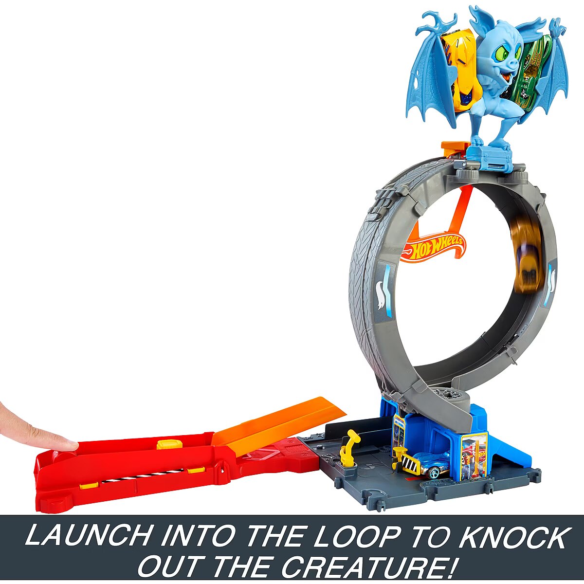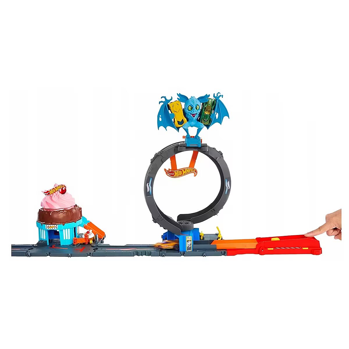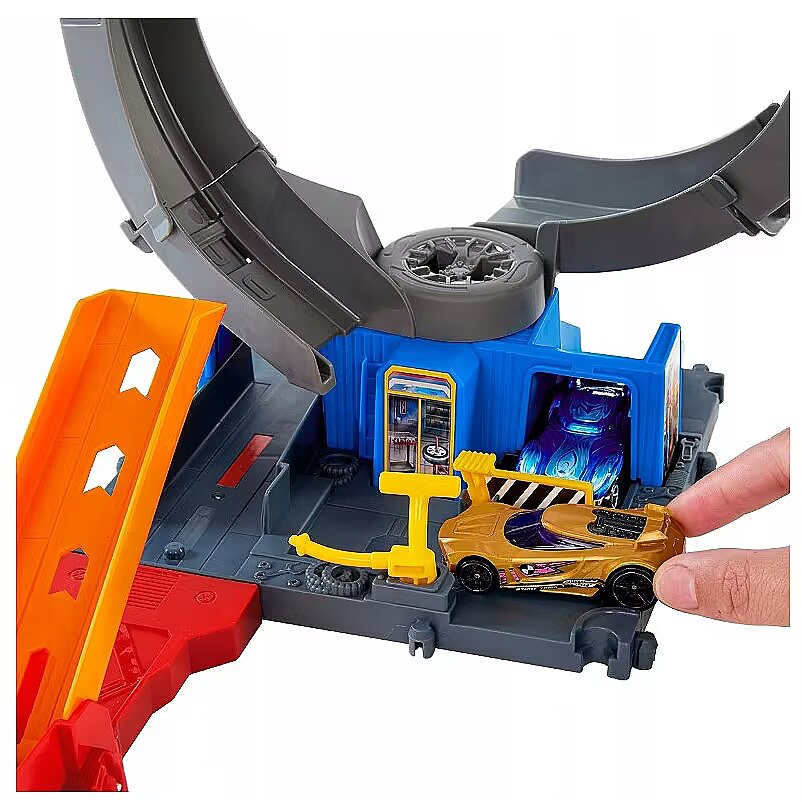 LongDesc - A wild bat has attacked the Hot Wheels City tire shop just like in the Netflix series 'Let's Race', and it's up to kids with great stunting skills to take it out. Launch cars through a loop to knock out the bat or adjust the loop and launcher to take direct aim at the creature. Kids can also focus on the track play and avoid the nemesis by racing under the loop and onto other adventures. Connect it to other Hot Wheels tracks and sets for open-ended play. One Hot Wheels 1:64 scale vehicle is included; additional tracks and set sold separately. Colours and decorations may vary.