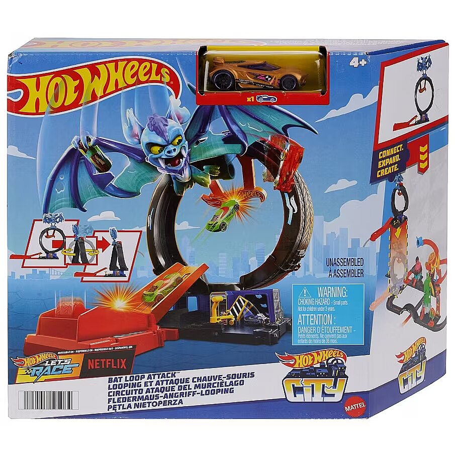 LongSummaryDescription - Hot Wheels City Bat Loop Attack Playset & 1:64 Scale Toy Car, Featured in the series “Let’s Race”. Product type: Vehicle & track set, Recommended age (min): 4 yr(s), Recommended age (max): 99 yr(s), Material: Plastic, Product colour: Multicolour