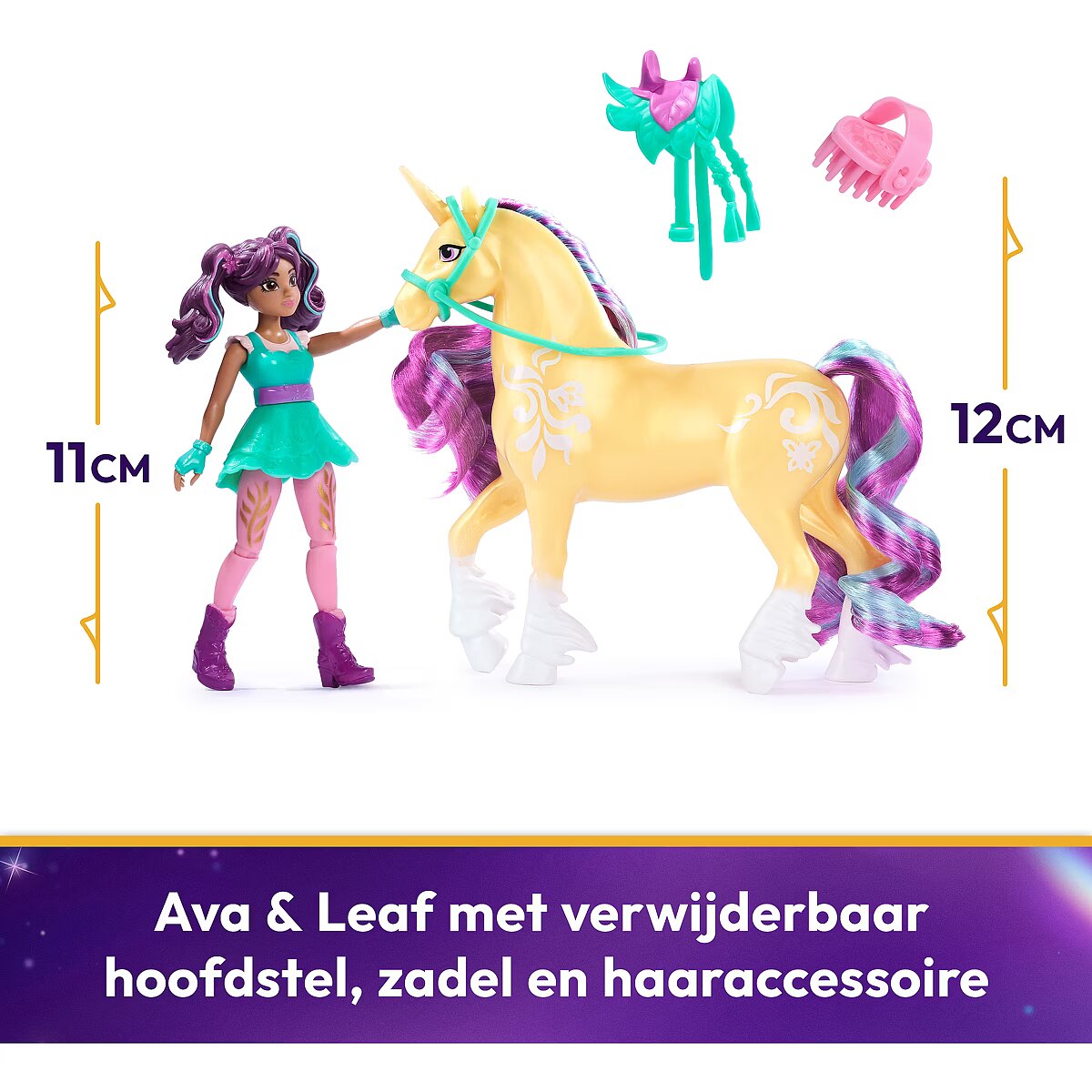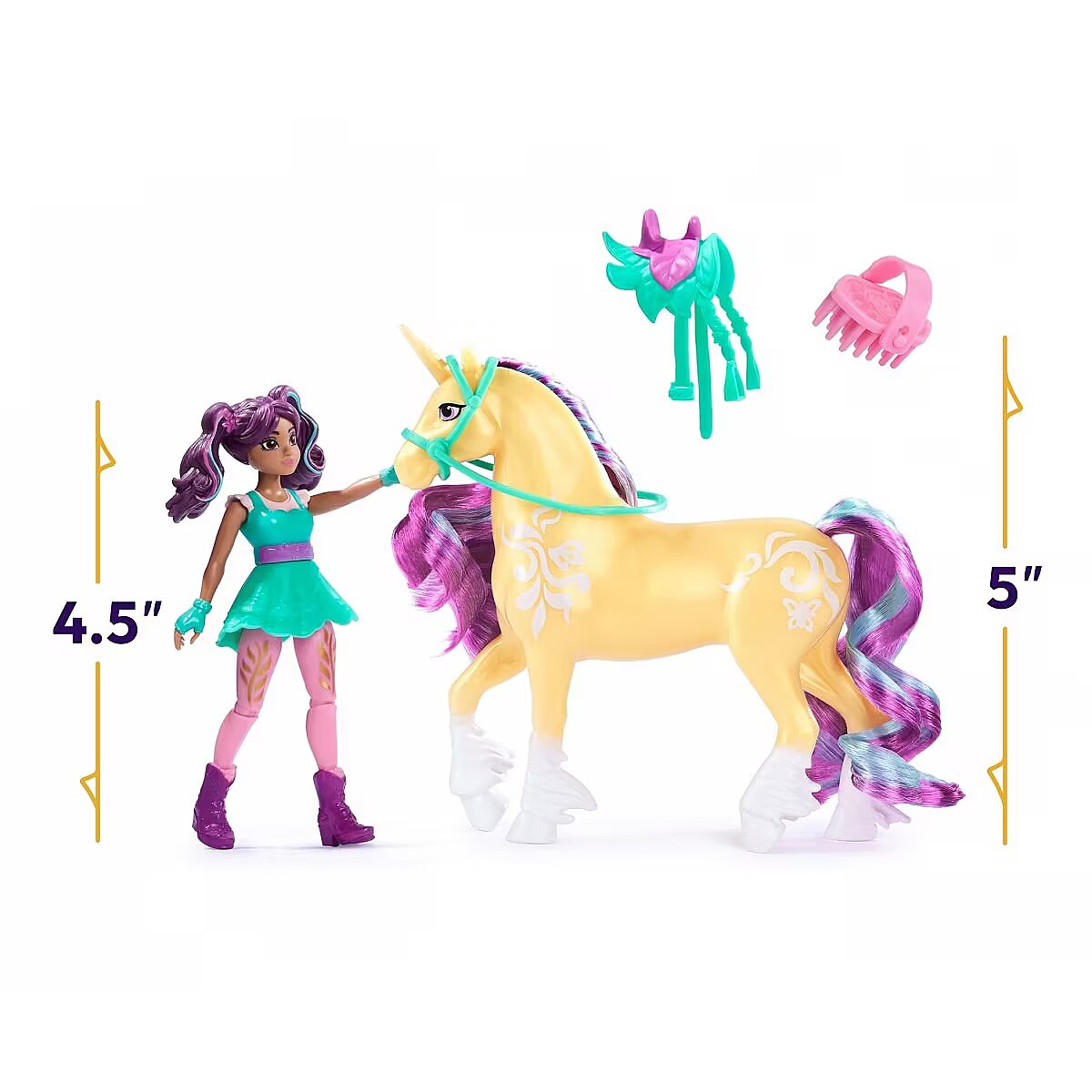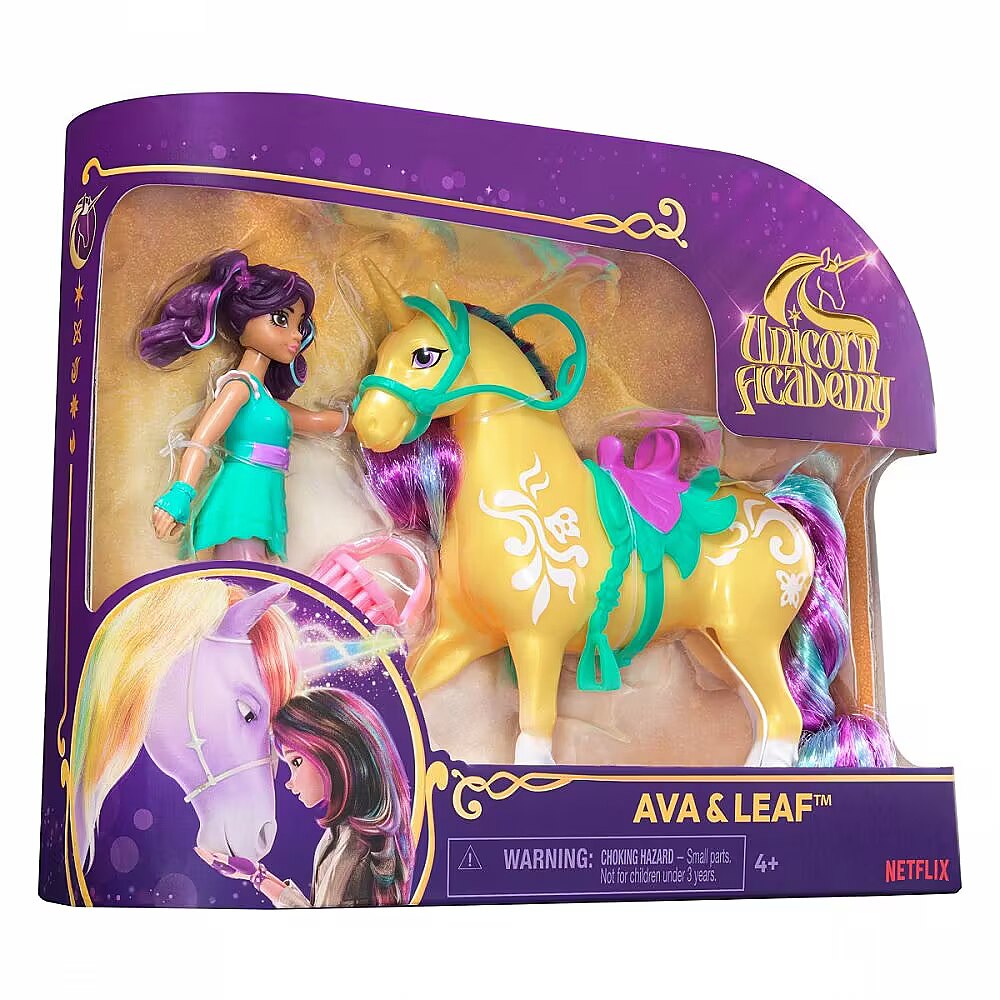 LongDesc - Celebrate the bond between rider and unicorn with the Unicorn Academy Ava & Leaf Set. Inspired by the NETFLIX animated show and best-selling book series where friendship reins, this set will spark endless imaginative storytelling. 4.5-inch Ava features realistic true-to-show details and 7 points of articulation for dynamic poses. Leaf stands at 5 inches tall, complimenting Ava’s look with Plant Magic markings and brushable purple and teal mane and tail (brush included). As you play, pose Ava to sit on Leaf and ride into adventure. With the removable bridle and saddle accessories, Ava can securely stay in place on Leaf. For more ways to experience Unicorn Academy with your favorite characters, look for the other small dolls, including Sophia, Layla, Isabel, Valentina, and their unicorns (sets sold separately) and expand your world. For kids who enjoy unicorns and horse toys, dolls & accessories, doll house play, collectibles, plush toys and more, Unicorn Academy toys are fun birthday gifts for girls or gifts for any occasion. Experience enchanting Unicorn Academy adventures with the Ava & Leaf Set.Includes: 1 Doll, 1 Unicorn, 1 Removable Saddle, 1 Removable Bridle, 1 Hair Styling Tool