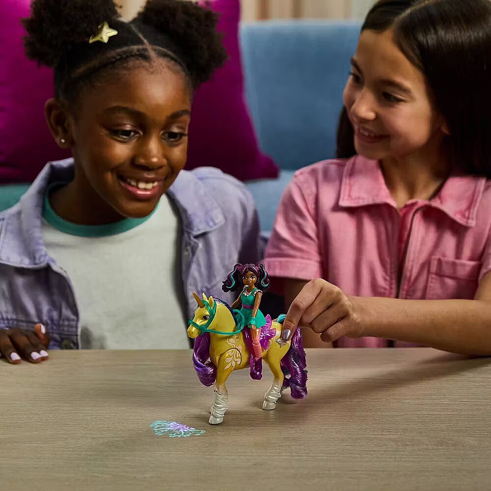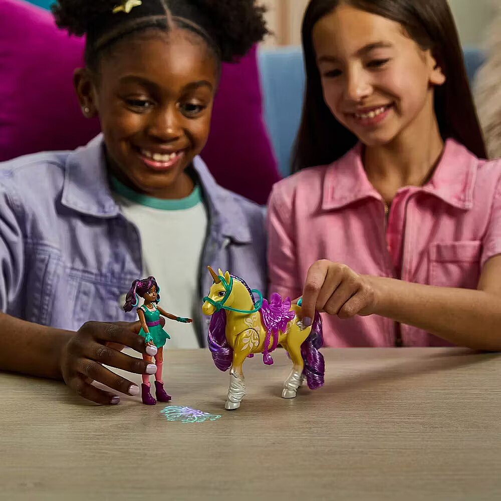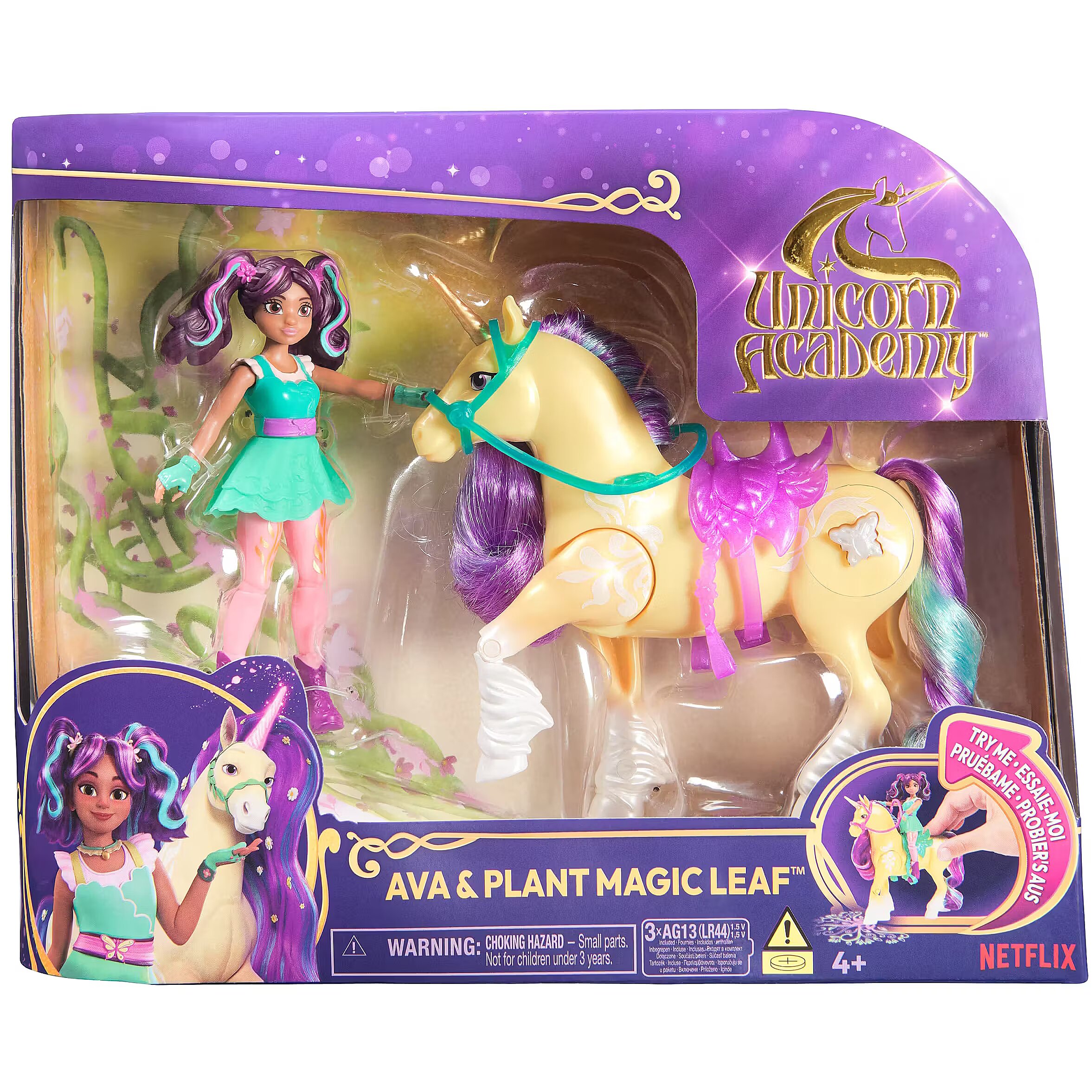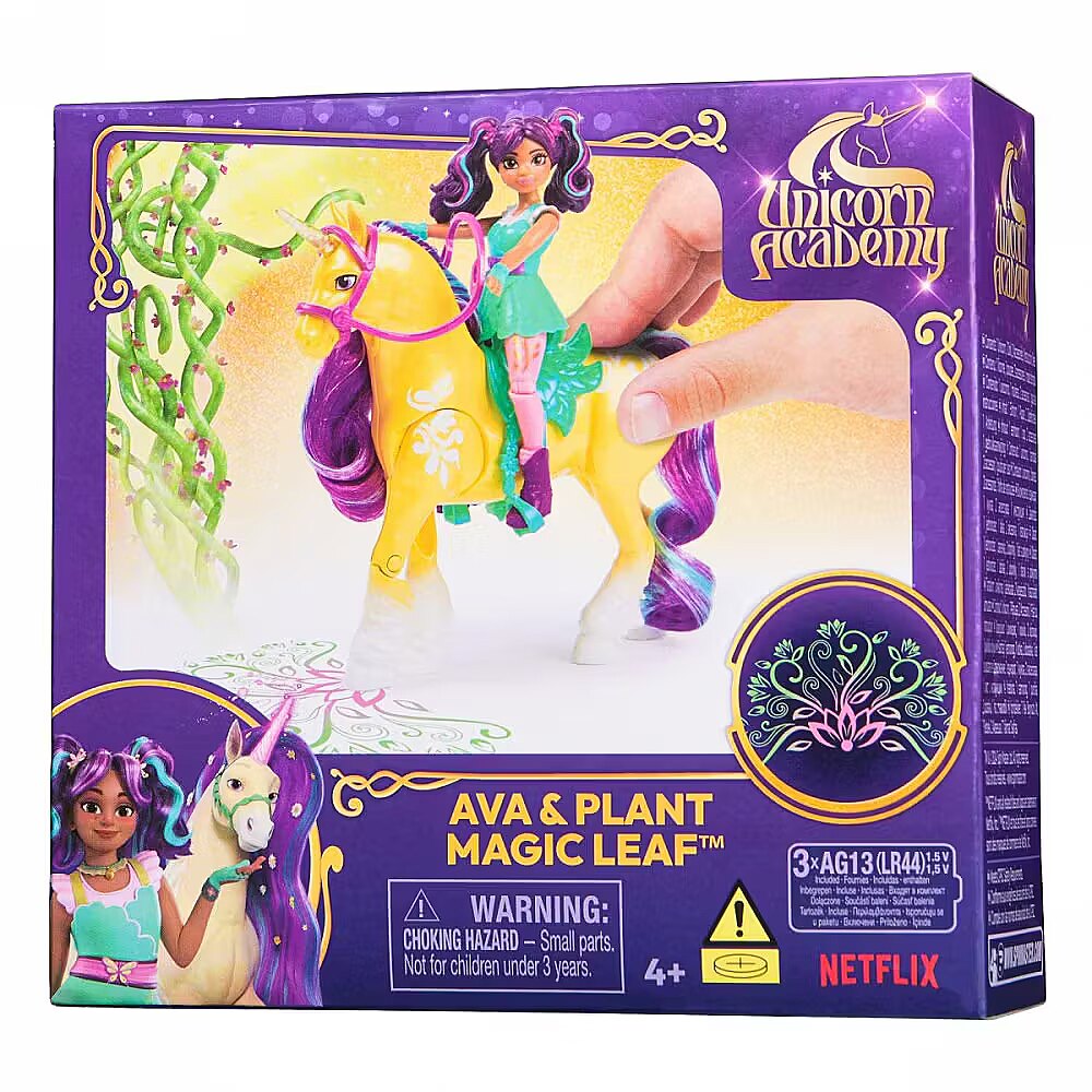 LongDesc - Experience the magic of Unicorn Academy with Ava & Plant Magic Leaf. Inspired by the NETFLIX animated show and book series where friendship reins, this duo celebrates the unique bond between rider and unicorn. With their true-to-show details and soft mane and tail, and real light effects on Leaf, this set will spark enchanting imaginative play. Featuring 7 points of articulation, pose Ava to ride Leaf and press the butterfly marking button on the unicorn’s side to activate the lights (3 LR44 batteries included) as you recreate your favorite scenes. Leaf stomps her hoof, using her Plant Magic to project a colorful pattern, like in the show. Ava securely stays in place on Leaf with the removable bridle and saddle accessories. For more ways to experience Unicorn Academy with your favorite characters, look for the other small dolls, including Sophia, Layla, Isabel, Valentina, and their unicorns (sets sold separately) and expand your world. For kids who enjoy unicorns and horse toys, dolls & accessories, doll house play, collectibles, plush toys and more, Unicorn Academy toys are fun birthday gifts for girls or gifts for any occasion. Shine bright in your Unicorn Academy adventures with Ava & Plant Magic Leaf.Includes: 1 Doll, 1 Unicorn, 2 Removable Accessories (Bridle & Saddle), 1 Instruction Sheet