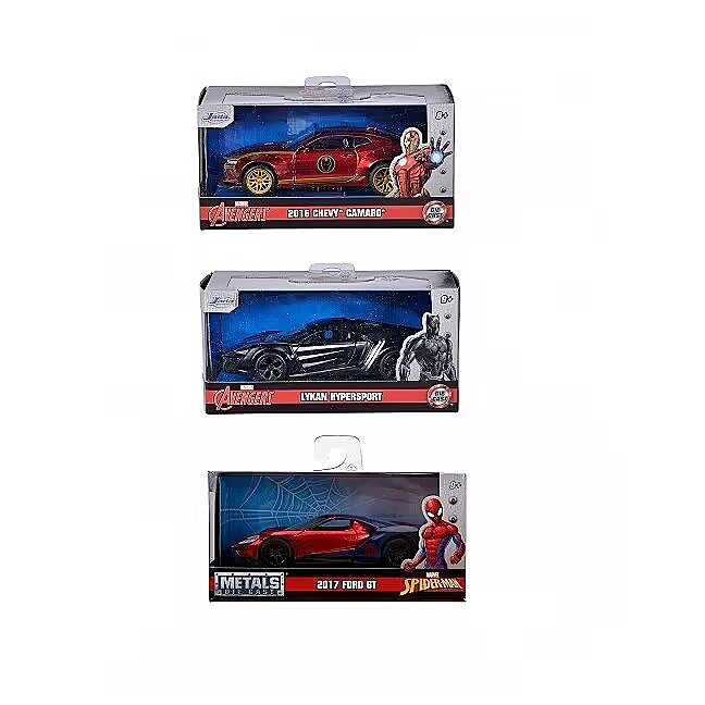 Description - JADA Marvel vehicles 1:32, 14 cm Metal vehicles from the MARVEL films. The display includes six vehicles: 2 x Spiderman, 2 x Ironman, 2 x Black Panther. The vehicles have opening doors. Product sent at random, it is not possible to choose a specific model. Price is for one item.