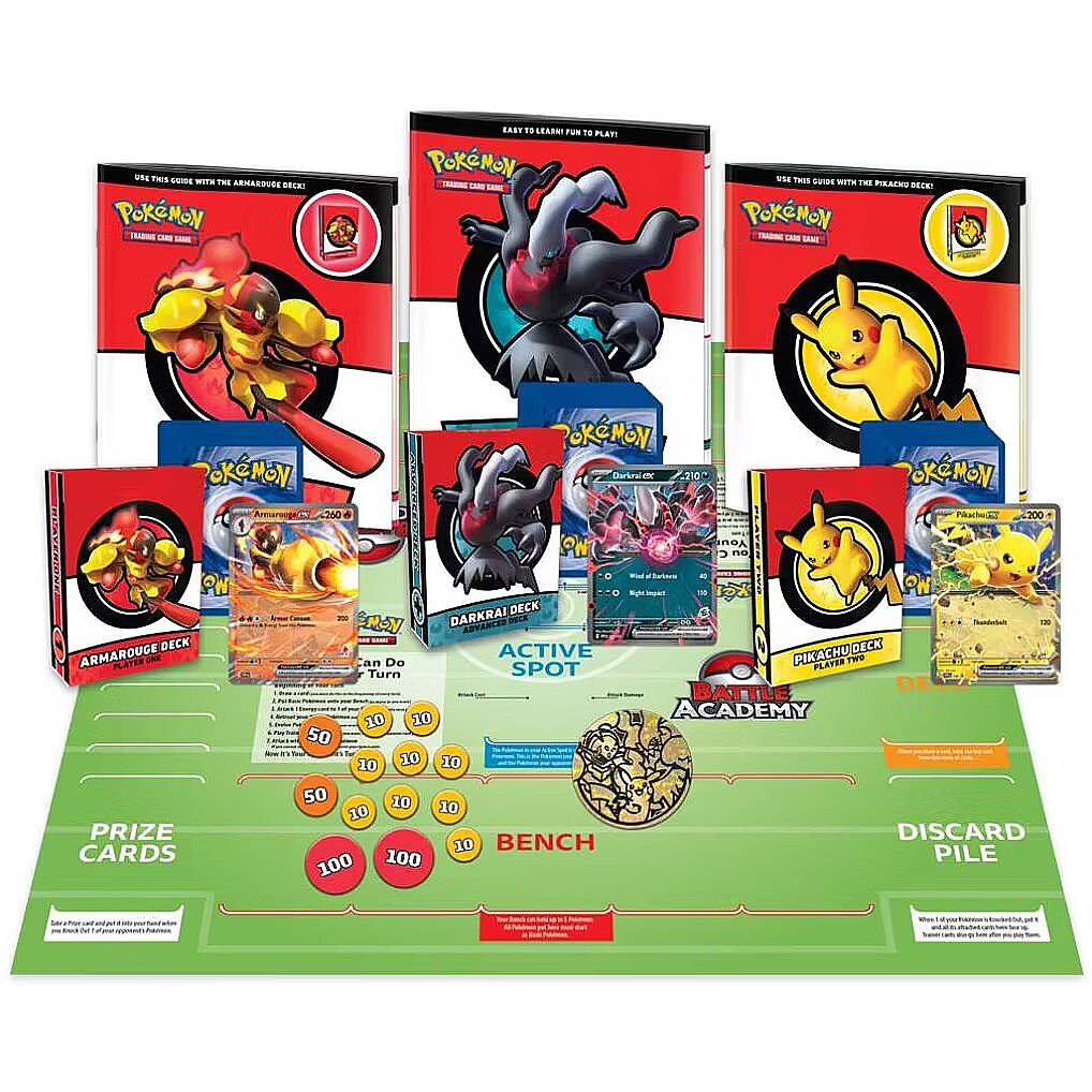 Pridedami priedai - 3 iš anksto paruoštos Pokémon TCG kaladės: Pikachu, Armarogue, Darkrai (po 60 kortų) 3 kaladžių dėžutės 2 pradedančiųjų vadovai, kaip pradėti žaisti 1 išsamus taisyklių vadovas 2 žaidėjų žaidimo lenta Metalinė moneta Žalos žymeklių rinkinys Pokémon TCG Online žaidimo kodas