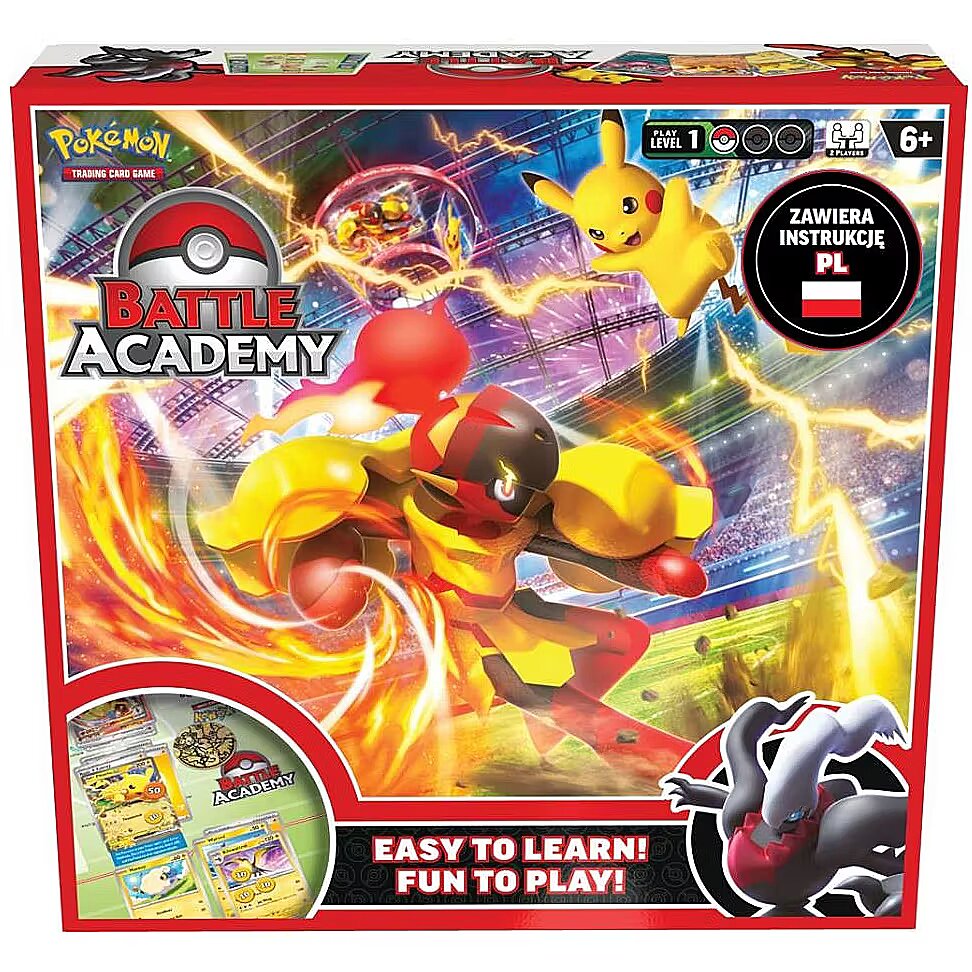 Aprašymas - "Battle Academy" - tai puikus būdas pradėti Pokemonų kortų žaidimo nuotykius, o oficialios lenkų taisyklės pateiktos dviejuose vadovuose, kurie padės jums pradėti žaisti! Rinkinyje yra trys paruoštos žaisti kaladės, kuriose yra po 60 kortų, supakuotos kartoninėse dėžutėse. Kiekvienoje iš jų yra galingų Pokemonų ex ir siūlomos skirtingos žaidimo strategijos. Pikachu Ex yra elektrinis pokemonas, kurio galinga ataka gali padaryti skaudžios žalos kiekvieną ėjimą, o dėl mažos atsitraukimo kainos jis gali palikti mūšio lauką patogiu metu, atimdamas iš priešininko dvi apdovanojimo korteles už jo nugalėjimą. Darkrai ex yra tamsos tipo pokemonas, jis turi dvi atakas, o viena iš jų gali daryti žalą nuo antrojo savo ėjimo. Armarouge ex yra Charcadet evoliucija, turinti labai daug ištvermės taškų ir absurdiškai galingą ataką, tačiau jos išmetimas kainuoja vieną energijos kortelę. Dėl evoliucijos jo iš karto į mūšio lauką neišvesime, tačiau gerai suplanavus jis gali pakreipti jėgų pusiausvyrą mūsų naudai. Dvikovos arenoje naudojant šias kaladėles yra dinamiškos ir įdomios, o per kiekvieną susirėmimą įgyjame naujos patirties. Dėl lenkiškų žaidimo taisyklių galime išmokti ėjimų seką ir vesti žaidimą su angliškai nekalbančiais žmonėmis, o įgudę galime pakeisti kaladę ir išbandyti savo jėgas su kita konfigūracija. Po kelių žaidimų galime pradėti tobulinti savo mėgstamą kaladę naujomis kortomis, kurias galime įsigyti pirkdami kitus Pokémon TCG produktus arba keisdamiesi su kitais žaidėjais. Pokémon TCG žaidime svarbu ir rinkti kortas, ir kurti veiksmingą taktiką, ir tinkamai naudoti savo gebėjimus. Su "Battle Academy" galite imtis Pokemonų trenerio vaidmens ir įgytas žinias paversti pergalėmis. Ar esate pasiruošę kitai dvikovai?