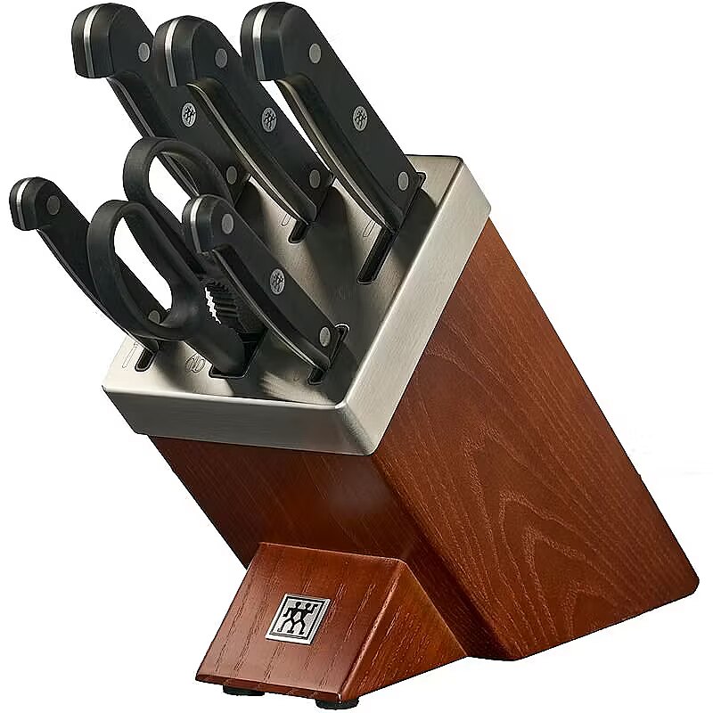 Accessories included - 1 vegetable and fruit knife - 10 cm 1 utility knife - 13 cm 1 cold meat knife - 20 cm 1 chef's knife - 20 cm 1 bread knife - 20 cm 1 multi-functional kitchen scissors 1 self-sharpening knife block