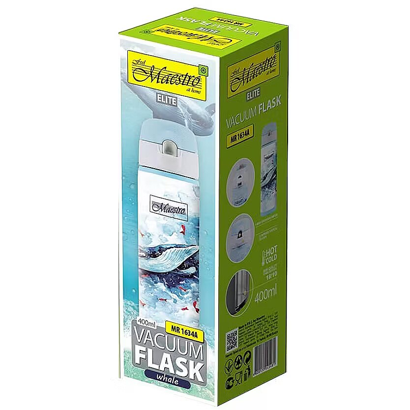 Aprašymas - "WHALE" "Maestro MR-1634-A" terminis puodelis yra puikus pasirinkimas žmonėms, vertinantiems patogumą ir ilgai išlaikantiems karštus gėrimus. Jo talpa - 400 ml, jis pagamintas iš aukštos kokybės 18/10 nerūdijančio plieno, kad būtų patvarus ir atsparus pažeidimams. Puodelis yra 22 cm aukščio, 6,5 cm skersmens ir sveria 266 g, todėl yra lengvas ir patogus. Dėl "Thermo Power" vakuuminės izoliacijos ir dvigubų sienelių puodelis veiksmingai išlaiko šaltus gėrimus karštus iki 24 valandų, o karštus - iki 12 valandų. Puodelyje įrengtas mygtukinis atidarymo kamštelis ir patogus gertuvės "snapelis", todėl galima gerti neatsukant dangtelio. Be to, jis turi atidarymo užraktą, apsaugantį nuo atsitiktinio gėrimo išsiliejimo. Puodelis sandariai uždarytas dėl dvigubo sandariklio, o neslystantis guminis pagrindas ir gumuotas korpusas užtikrina stabilumą ir patogumą naudojant. Maestro puodelis nesugeria kvapų, todėl idealiai tinka įvairiems gėrimams. Dėl savo universalumo puodelis telpa į automobilio laikiklį, todėl jis taip pat yra praktiškas pasirinkimas keliaujant.