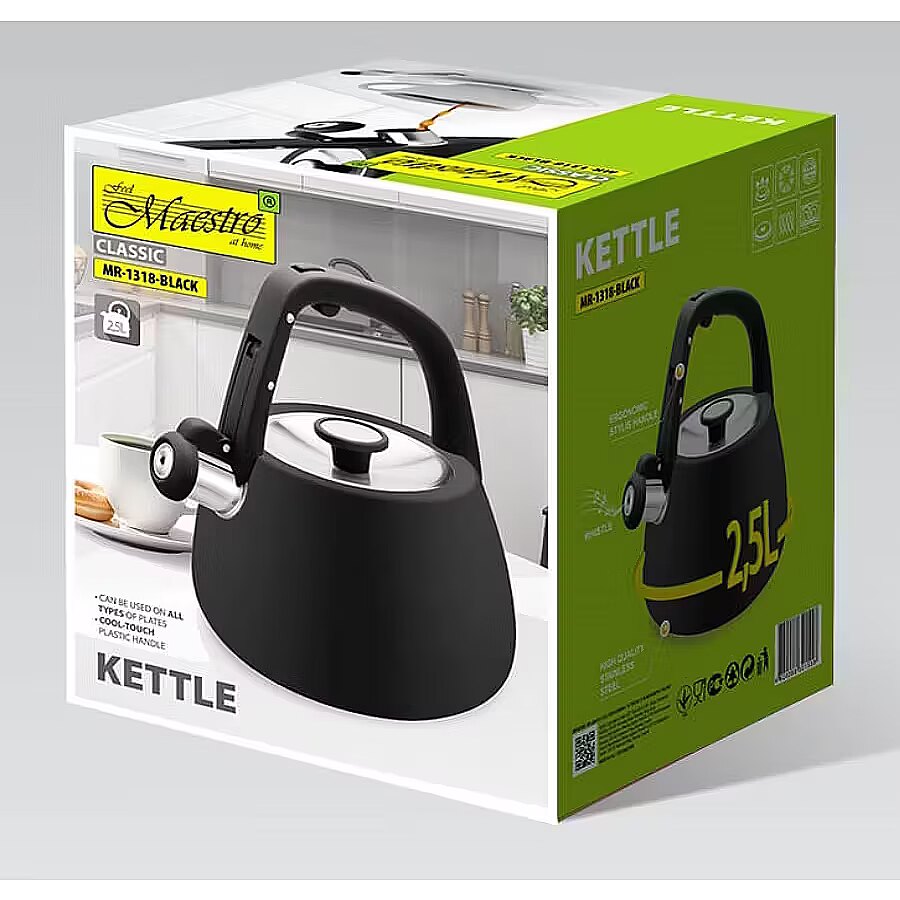 Description - Czajnik nieelektryczny Maestro MR-1318-BLACK to funkcjonalne urządzenie z gwizdkiem, które sprawdzi się w każdej kuchni. Wykonany z wysokiej jakości stali nierdzewnej, cechuje się solidnością oraz eleganckim wyglądem. Pojemność czajnika wynosi 2,5 litra, co umożliwia jednorazowe zagotowanie ilości wody, idealnej na herbatę lub kawę dla całej rodziny.