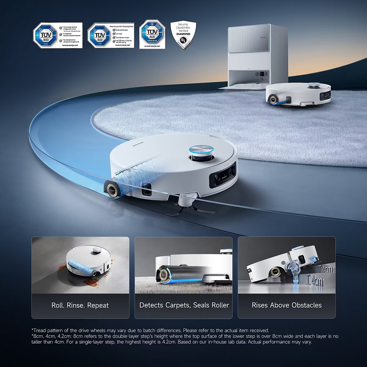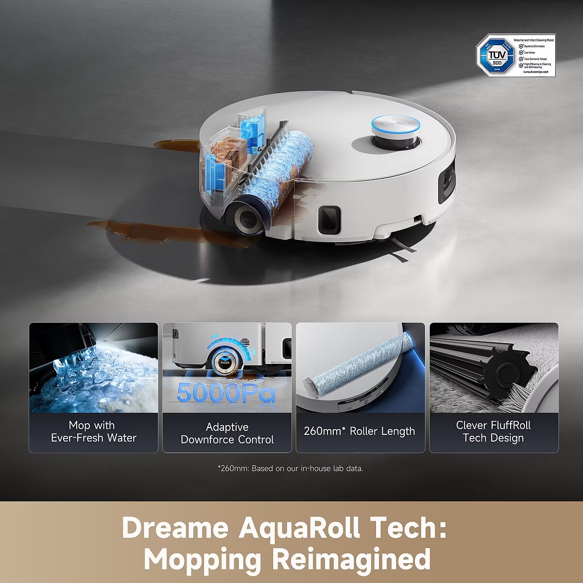 LongDesc - Pirmasis pasaulyje "AquaRoll™" šlavimo robotas dulkių siurblys, užtikrinantis prisitaikantį valymą visuose namuoseRoll. Rise. Atsinaujinkite"Dreame Aqua10 Ultra Roller", pirmasis pasaulyje "AquaRoll™" robotas dulkių siurblys, praplečia dulkių siurblio galimybių ribas. Jis be jokių apribojimų prisitaiko prie jūsų grindų, automatiškai atsinaujina ir laisvai juda, kad susidorotų su įsisenėjusia netvarka, pateikdamas išmanesnį ir lengvesnį viso namo valymo sprendimą.Minimalistinis dizainas, maksimalus poveikis.Paprastas. Sudėtinga. Išmanus.Švarios kubinės formos ir futuristinės detalės. Lazeriu išpjautas galvaninis skydelis, pusiau skaidrios medžiagos ir aptakus, skulptūriškas dangtis - dizainas žaidžia su šviesa ir šešėliais visą dieną, suteikdamas modernios elegancijos ir dinamiškos energijos kiekvieniems namams.Visada švarus. Visada spindintis.Valtelis nuolatos valomas ir atnaujinamas šluojant - todėl niekada pakartotinai nenaudoja nešvaraus vandens ir neplatina nešvarumų. Riebalai, išsilieję skysčiai ir sunkios dėmės nušveičiamos realiuoju laiku, todėl grindys bus tikrai švarios, o ne tik nuvalytos.Visada šviežias vanduo,visada švarios grindys.Pamirškite pasenusias šluostes ir pelėsių kvapus, šviežias vanduo išplauna volą realiuoju laiku, užtikrindamas, kad kiekvienas grindų centimetras būtų nušveistas šviežiai ir higieniškai.Pūkuotas, bet niekadaneišsipurvina darbo vietoje"FluffRoll™" technologija leidžia voleliui pasiekti gilias siūles ir įtrūkimus, padeda efektyviau pakelti išdžiūvusias dėmes. O priešingai besisukantis velenėlis palaiko švarų, purų ir pasiruošusį kitai nešvarai.Kilimų priežiūra be rūpesčiųAutoSeal™ velenėlio apsauga aktyviai užsandarina velenėlį, kai aptinka kilimus - taip užkertamas kelias drėgmės nutekėjimui ir užsitęsusiems kvapams.Savaiminio valymo karšta rutinaPo kiekvieno valymo dulkių siurblys gauna "karštą vonią" su 212°F "ThermoHub™" savaiminio valymo technologija - ji pašalina nešvarumus ir kvapus nuo volelio, kad kiekvieną kartą pradėtumėte iš naujo.Bet greitas atvėsimas nekenkiant PTC sistema po valymo greitai atvėsta, užtikrindama, kad plovimo lentą būtų saugu liesti visiems jūsų namuose."FlexRise™" pneumatinė pakaba:Nedidelio pravažumo meistriškumas jūsų namamsKai kiti vis dar blaškosi susidūrę su kliūtimis, "ProLeap™" sistemainteligentiškai pakelia ištraukiamas kojas, kad be vargo įveiktų iki 3 kliūčių.15 colių - aukščiausiai savo klasėje.Keep Šepetėliai išlieka sausiŠluojant, TripleUp™ technologija pakelia šoninius (0,39 colio) ir pagrindinius (0,2 colio) šepetėlius, kad būtų išvengta sąlyčio su vandeniu - šluostė susidoroja su įsisenėjusiomis dėmėmis, o drėgmės nesiveja aplink. Dėl to šepetėliai išlieka sausi, išvengiama nemalonių kvapų ir užtikrinamas didžiausias dulkių siurbimo našumas.Patobulinta "AstroVision™": NVIDIA varomas kliūčių intelektas per RL mokymąGyvūnai klaidžioja, žaislai išsibarsto, baldai pasislenka - dulkių siurblys visa tai mato. 2 dirbtinio intelekto kameros kartografuoja 3D detales ir piršto tikslumu (0,04 col.) išvengia daugiau kaip 240 objektų - nuo įkrovimo laidų iki naminių gyvūnėlių žaislų.Pagal NVIDIA ir RL mokymą jis aktyviai prisitaiko prie chaoso: orientuojasi žaidimų zonose, išvengia klaidžiojančių naminių gyvūnėlių ir nukreipia aplink netikėtumus. Pagaliau šis dulkių siurblys susitvarkys su netvarka namuose taip pat sklandžiai, kaip ir jūs.Valymas nuo krašto iki kraštoPapildytas "StereoEdge™" technologija, jo 3D matymas akimirksniu pastebi užkliuvusius laidus ir nepatogias baldų kojeles, apeidamas jas natūraliu tikslumu kaip profesionalas. Dabar jums nebereikės gelbėti užstrigusio roboto.Šoninis padengimasDetalioji "SideReach™" technologija leidžia robotui dulkių siurbliui išvalyti nešvarumus ankštose vietose ir kampuose. Nesipainiojantis šepetys susidoroja su paslėptomis dulkėmis aplink baldų kojas - nepalikdamas jokios netvarkos.Išplėstinis valymasValcinė šluostė protingai išsitraukia už savo rėmo, kad pasiektų kiekvieną centimetrą palei sienas ir kampus - nebereikės rankiniu būdu paliesti. Jis automatiškai prisitaiko valydamas, todėl siauros erdvės šluojamos taip pat kruopščiai, kaip ir atviros grindys.Neįtikėtina siurbimo galia"TurboForce" variklis užtikrina iki 30 000Pa siurbimo galią, efektyviau ir tyliau pakeldamas 100 % dalelių ir 99 % plaukų, pavyzdžiui, įsisenėjusį purvą, užsispyrusius naminių gyvūnų plaukus, paslėptas šiukšles ir kt.Dvigubi šepečiai, dvigubas poveikis"HyperStream™" iššukavimo šepetys "DuoBrush" turi 2 šepetėlius, kurie prisitaiko prie kiekvieno paviršiaus jūsų namuose - tiek giliai valant kietas grindis, tiek specialiai prižiūrint kilimus, kuriuose nesusipainioja plaukai.Automatinis purvo aptikimasNuolat stebėdamas purvo lygį, jis automatiškai reguliuoja šluostės plovimo laiką ir paleidžia kitą šlavimo važiavimą, kad rezultatai būtų nepriekaištingi.Jokių varginančių naminių gyvūnėlių kvapųSusiduriate su užsitęsusiais naminių gyvūnėlių kvapais? Mūsų valymo tirpalas su natūraliais ingredientais aktyviai neutralizuoja pelėsių kvapus pačiame jų šaltinyje, o ne tik juos maskuoja, todėl namai kvepia itin gaiviai.Išmanusis kilimų atpažinimasLengvai programėlėje atvaizduokite visus kilimus ir kilimines dangas - nesvarbu, kokia jų forma ar kampas. Jūsų robotas nustato tikslią jų buvimo vietą ir pagal poreikį prisitaiko, kad būtų kruopščiai ir individualiai prižiūrimi.Pet-Friendly Care 4.0Šis dulkių siurblys sukurtas atsižvelgiant į naminių gyvūnų šeimininkus, todėl jame įdiegtas naminiams gyvūnams skirtų naujovių rinkinys, skirtas jūsų pūkuotiems draugams.Išmanusis valdymas balsuPaverskite savo robotą paklusniu pag