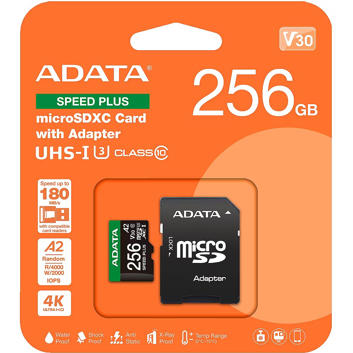 LongSummaryDescription - ADATA Speed Plus. Capacity: 256 GB, Flash card type: MicroSDXC, Flash memory class: Class 10, Read speed: 180 MB/s, Write speed: 160 MB/s, UHS Speed Class: Class 3 (U3), Video Speed Class: V30. Protection features: Drop proof, Magnet proof, Temperature proof, Waterproof, X-ray proof, Product colour: Black, Green, White