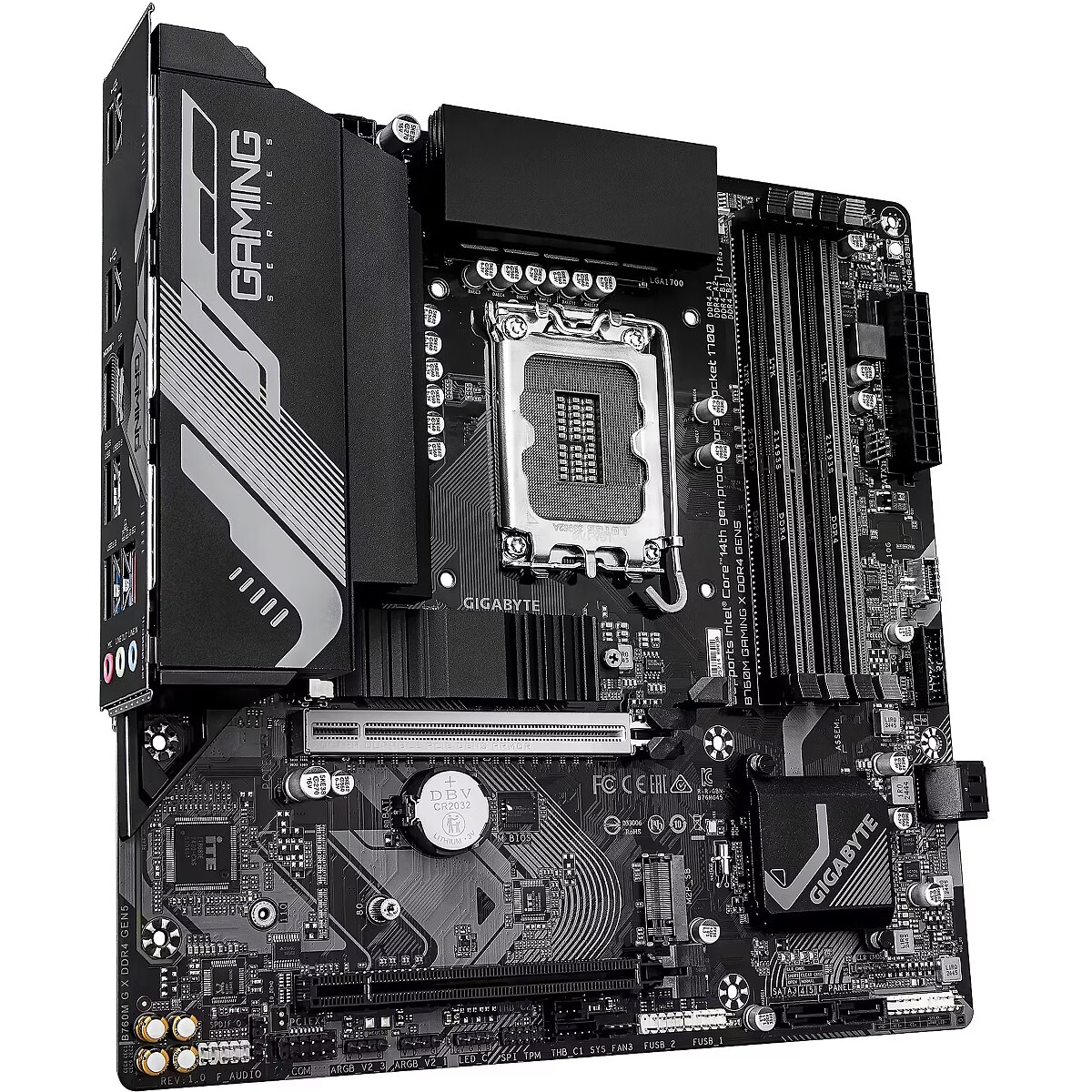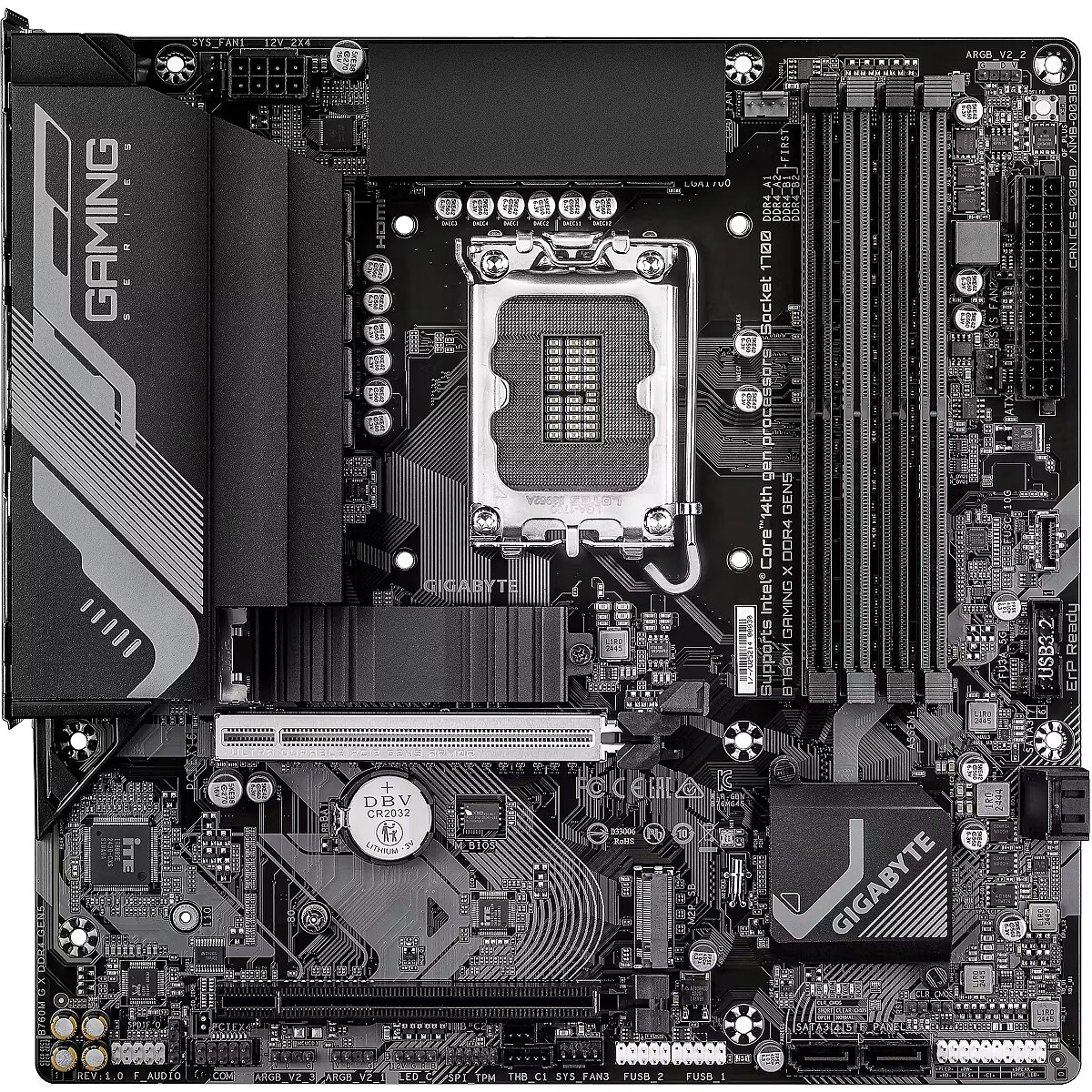 Summary - GIGABYTE B760M GAMING X DDR4 GEN5 Motherboard - Supports 14th Gen. Intel Core CPUs, 8+1+1 phases VRM, up to 3200MHz DDR4, 2xPCIe 4.0 M.2, 2.5 GbE LAN, USB 3.2 Gen 1. Processor manufacturer: Intel, Processor socket: LGA 1700, Compatible processor series: Intel® Celeron®, Intel Core i3 12th Gen, Intel Core i3 13th Gen, Intel Core i3 14th Gen, Intel.... Supported memory types: DDR4-SDRAM, Maximum internal memory: 128 GB, Memory slots type: DIMM. Supported storage drive interfaces: M.2, PCI Express 4.0, SATA III, Supported storage drive types: HDD & SSD, RAID levels: 0, 1, 5, 10. Maximum resolution: 4096 x 2304 pixels. Ethernet interface type: 2.5 Gigabit Ethernet, LAN controller: Realtek RTL8125