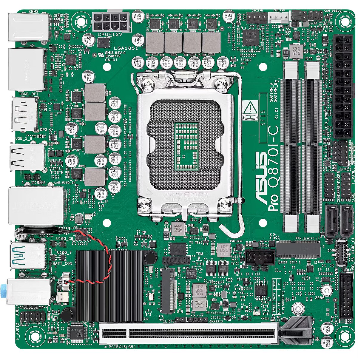 LongSummaryDescription - ASUS PRO Q870I-C-CSM. Processor manufacturer: Intel, Processor socket: LGA 1851 (Socket V1), Compatible processor series: Intel Core Ultra (Series 2). Supported memory types: DDR5-SDRAM, Maximum internal memory: 128 GB, Memory slots type: SO-DIMM. Supported storage drive interfaces: M.2, SATA III, Supported storage drive types: HDD & SSD. Ethernet interface type: Fast Ethernet, Gigabit Ethernet, LAN controller: Intel WGI219LM. Component for: PC, Motherboard form factor: mini ITX, Motherboard chipset family: Intel