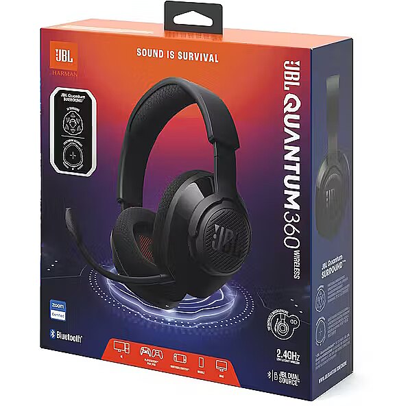 LongDesc - Never miss a moment with dual wireless connectionWhen split-second timing is key, you can't be tied down to your system. Gaming grade lossless 2.4GHz wireless gives you total freedom of movement, with no audio drops in the heat of battle. This headset is also compatible with all Bluetooth enabled devices, such as smartphones and tablets.Live the game with JBL QuantumSURROUND Sound SignatureFrom the quietest footsteps to the loudest laser blasts, JBL's cinematic QuantumSURROUND Sound signature makes every scene epic. Powered by 40mm drivers, the JBL Quantum 360 Wireless fully immerses you in the game for a true competitive edge.Breathable fabric ear cushions for marathon game sessionsThe durable JBL Quantum 360 Wireless has a lightweight headband and breathable fabric ear cushions with memory foam for total comfort even during a hardcore all-night epic.Sound is SurvivalReady to level up your gameplay? Meet the JBL Quantum 360 Wireless gaming headset. From the quietest footsteps to the loudest laser blasts, JBL’s QuantumSOUND Signature puts you in the center of every scene. No matter how crazy the action gets, the detachable, directional voice focus boom mic means other players can always hear you clearly. Lossless 2.4GHz & Bluetooth dual wireless connection, 22-hour battery life that you can charge while playing and lightweight, comfortable and breatheable fabric ear cushions with memory foam mean you’ll never miss a second of mayhem during even your longest gaming sessions. JBL QuantumENGINE PC software fine-tunes the sound for the ultimate competitive advantage. Your opponents won’t know what hit them.