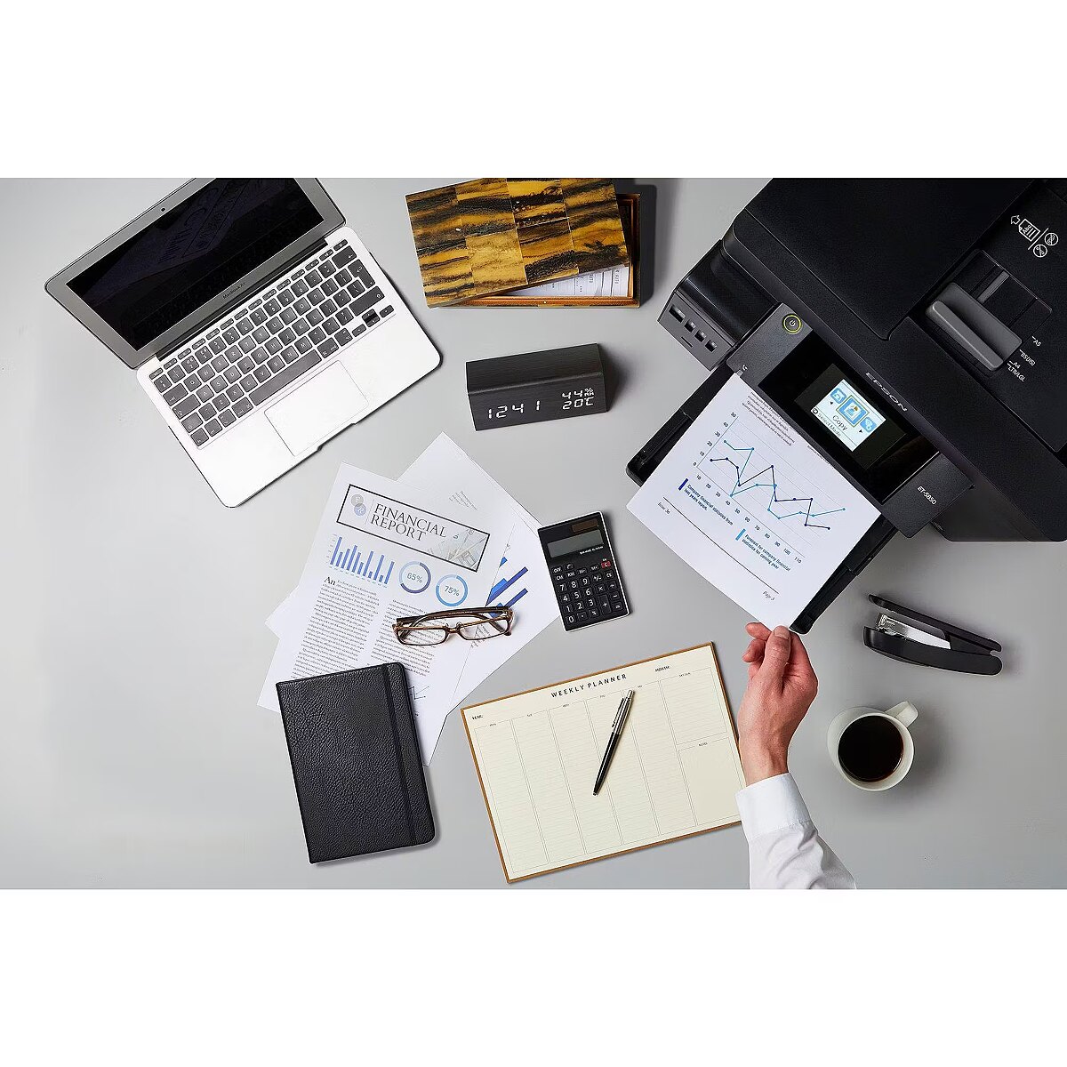 LongDesc - Padarykite daugiau per trumpesnį laikąS šiuo greitu ir efektyviu spausdintuvu, kuris pirmąjį puslapį atspausdina vos per 5½ sekundės*, įgyjate pranašumą. Kartu su sparčiu dvipusiu spausdinimu ir sparčiu automatiniu dokumentų tiektuvu galėsite greičiau atlikti kasdienes užduotis.Didelė A4 formato "EcoTank" funkcijaTačiau ET-5805 skirtas biuro užduotims atlikti - A4 formato spausdinimui, skenavimui, kopijavimui ir faksui. Pasirinkti funkcijas paprasta naudojant LCD jutiklinį ekraną.SutaupykiteSutaupykite kiekvieną kartą spausdindami su šiuo "EcoTank", kuris užtikrina neįtikėtinai mažą vieno puslapio kainą. Skirtingai nei kiti spausdintuvai, "EcoTank" turi dideles rašalo talpyklas, kurias pripildysite pigaus rašalo buteliukais.Pabaiga pertraukomsSumažinus papildymų skaičių, šis "EcoTank" gali atspausdinti tūkstančius puslapių, kol prireiks daugiau rašalo, o du priekiniai popieriaus dėklai talpina 500 lapų. Išlaisvinkite save nuo rankinio puslapių krovimo, naudodami talpų 50 lapų galinį padavimo įtaisą ir A4 formato ADF.Spausdinkite beveik iš bet kurDėl "Wi-Fi" ir "Wi-Fi Direct" galite siųsti dokumentus spausdinti iš išmaniuosiuose įrenginiuose naudodami "Epson Smart Panel" programėlę*. Taip pat yra eterneto funkcija.Lengva naudoti ir patikimaDidelius priekinius rašalo rezervuarus paprasta pripildyti naudojant pakartotinai uždaromus, intuityvius ir nelašėjančius rašalo buteliukus. Šilumos neišskirianti "PrecisionCore" spausdinimo galvutė garsėja savo greičiu, kokybe, patikimumu ir efektyvumu bei tarnaus visą spausdintuvo eksploatavimo laiką.