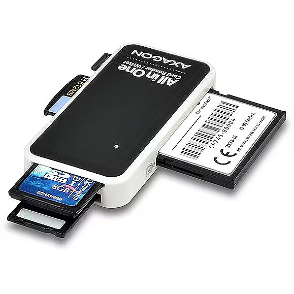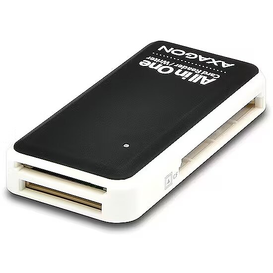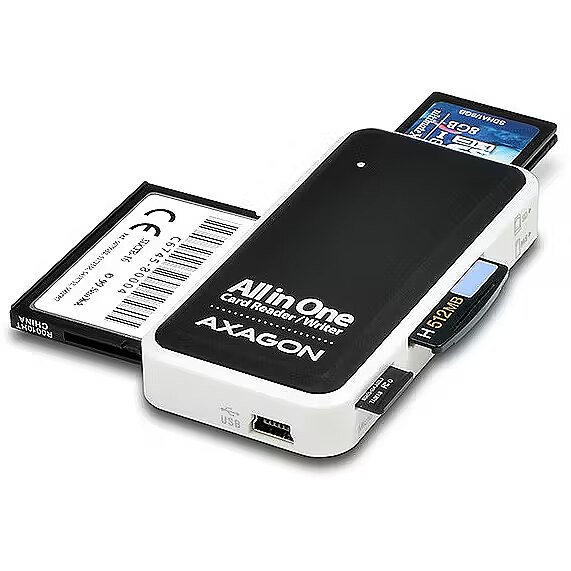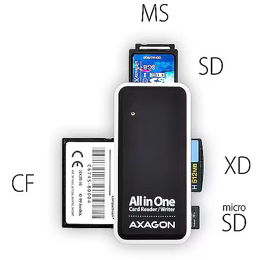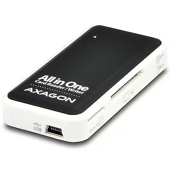 ShortSummaryDescription - Axagon CRE-X1 external 5-slot reader of memory cards, CF, CF Type II, MMC, MMC Mobile, MMCmicro, MS Duo, MS PRO, Memory Stick (MS), MicroDrive, MicroSD..., Black, White, 480 Mbit/s, Plastic, CE, RoHS, USB 2.0