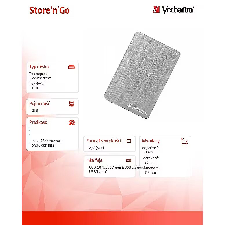 Aprašymas - „Verbatim Store n Go ALU 2TB“ – tai stilingas ir funkcionalus nešiojamas kietasis diskas, sukurtas patogiam duomenų saugojimui ir perdavimui. Jo šlifuoto aliuminio korpusas pasižymi modernia išvaizda ir tvirta konstrukcija, o kompaktiškas dydis leidžia jį lengvai nešiotis į darbą, namus ar kelionėms. Plonas dizainas, 9 mm storio ir sveriantis vos 150 g, užtikrina patogų kasdienį naudojimą.