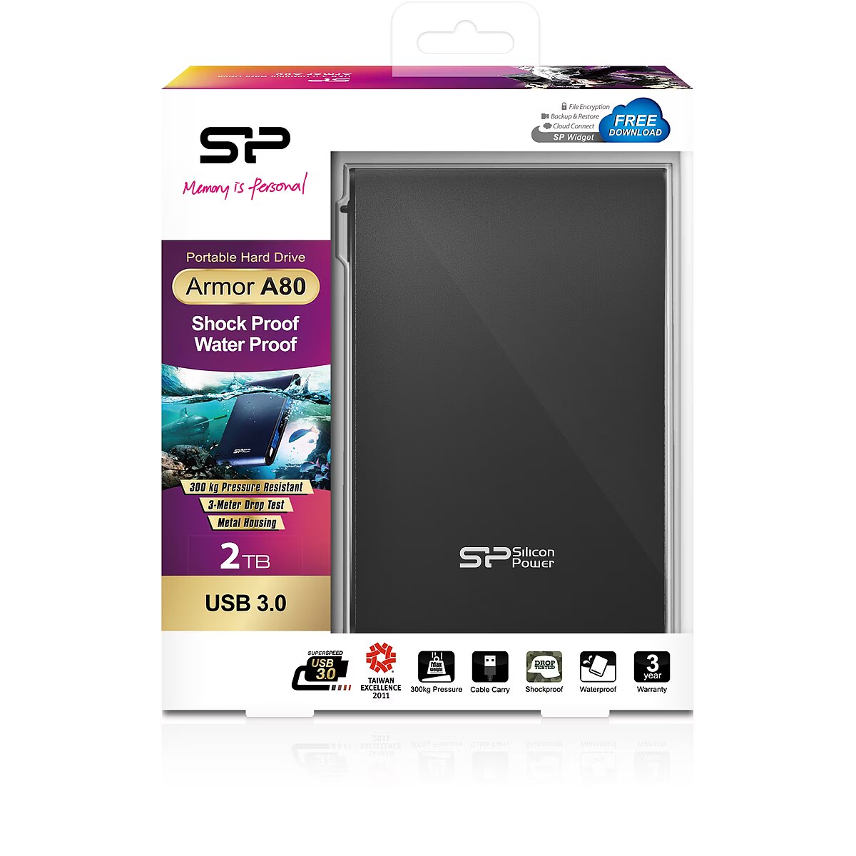 description_et - Peržiūrėkite "Silicon Power Armor A80" nuotraukų seriją "Photopoint" tinklaraštyje "Armor A80" kietasis diskas prijungiamas prie kompiuterio 70 % greičiau nei pagal dabartinį USB 2.0 standartą per USB 3.2 Gen 1 sąsają. Taip duomenys iš disko į kompiuterį ir atvirkščiai gali judėti neregėtu greičiu. Be to, A80 yra atsparus vandeniui, smūgiams, slėgiui ir dulkėms. Armor A80 turi specialią kabelio jungtį, skirtą trumpesniems USB kabeliams, todėl jį lengva nešiotis kišenėje. Pridedamas ir antrasis, ilgesnis USB kabelis. Korpusas atitinka IEC529 IPX7 atsparumo vandeniui testą (1 m panardinimas į vandenį iki 30 minučių) ir po panardinimo pilnai veikia. Korpusas taip pat atsparus dulkėms ir sutraiškymui, todėl yra paruoštas įvairiems netikėtumams, pavyzdžiui, lietui, vandens purslams ar nelaimingiems atsitikimams su sulčių stikline. "Armor A80" atitinka JAV MIL-STD-810F standartą (tranzitinis kritimo bandymas) ir gali būti be problemų numestas ant betono iš iki 122 cm aukščio. USB 3.2 Gen 1 standartas, taip pat suderinamas su USB 2.0 sąsaja Atitinka JAV standartą. JAV kariuomenės kritimo bandymo standartas MIL-STD-810F (tranzitinis kritimas), įskaitant: 1) laisvą kritimą ant betono ar kieto paviršiaus; 2) laisvą kritimą nuo nurodyto aukščio (122 cm); 3) visi 8 gaminio kampai, 12 šonų ir 6 paviršiai turi išlaikyti bandymą Atitinka IPX7 atsparumo vandeniui bandymą (1 m gylis iki 30 min.) Nemokama programinė įranga SP Widget, suteikia saugumo ir atsarginių kopijų kūrimo funkcijas.