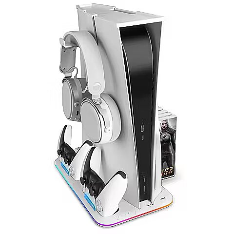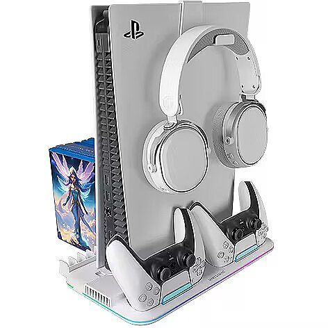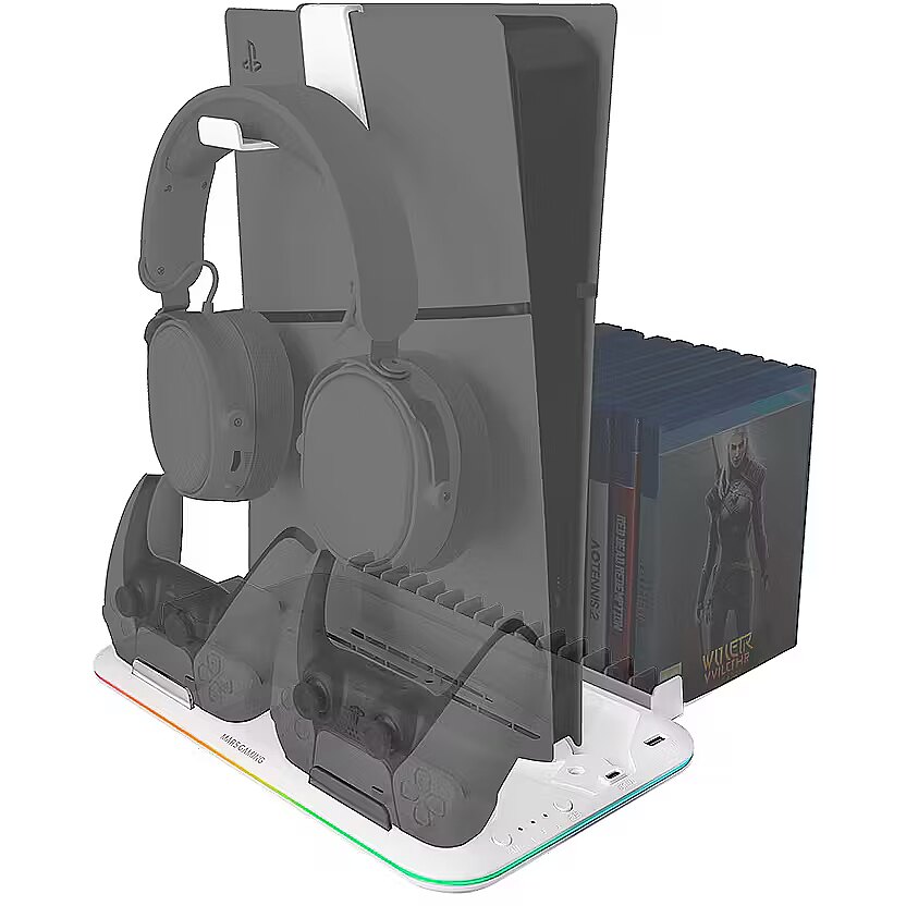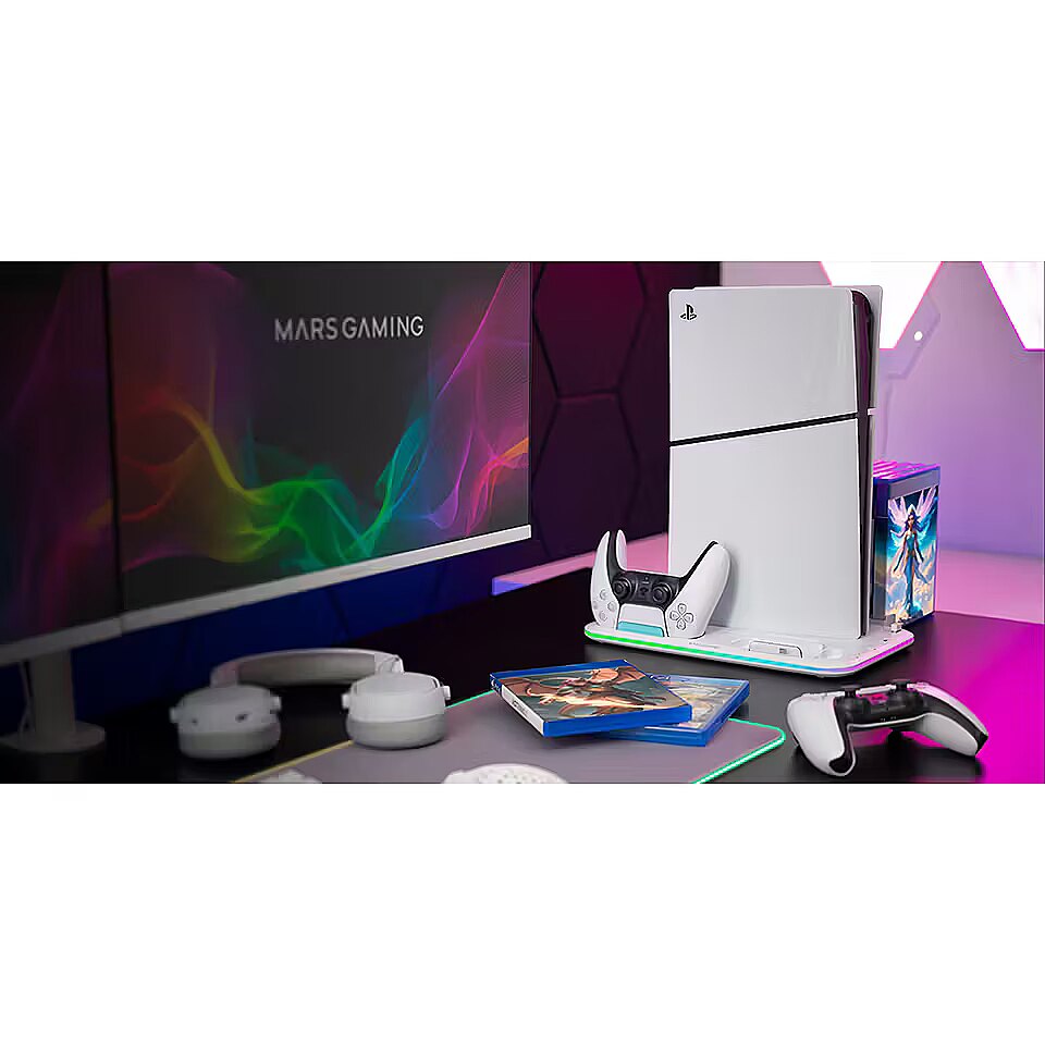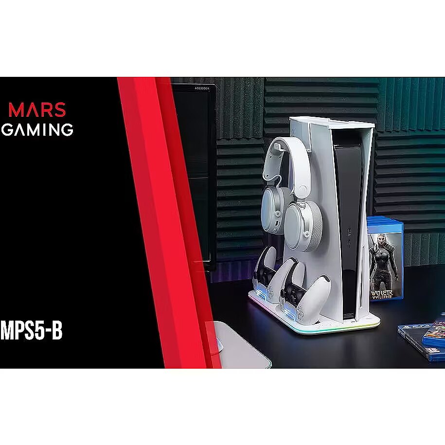 description_en - The MPS5-B2 stand for PS5 is the perfect all-in-one gaming accessory. It combines efficient cooling, neon RGB lighting, controller charging, an additional USB port, a headphone stand, and game storage in one place. Compatible with PS5 Slim, Standard, and Digital Edition consoles, this stand is designed to optimize your gaming setup. Take your gaming experience to the next level with the MPS5-B2 multifunction stand!
