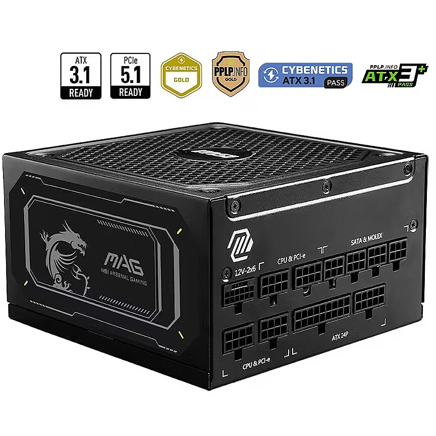- Maitinimo šaltinis (PSU): MSI MAG A1000GL PCIE5 II, 1000W, 80PLUS Gold, ATX 3.1, PCIe 5.1